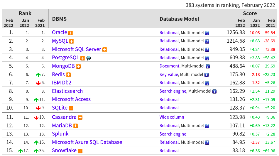 그밖에 눈에 띄는 DBMS는 Snowflake 입니다. 스코어도 많이 상승을 했지만 랭킹도 35위에서 15위로 무려 20단계가