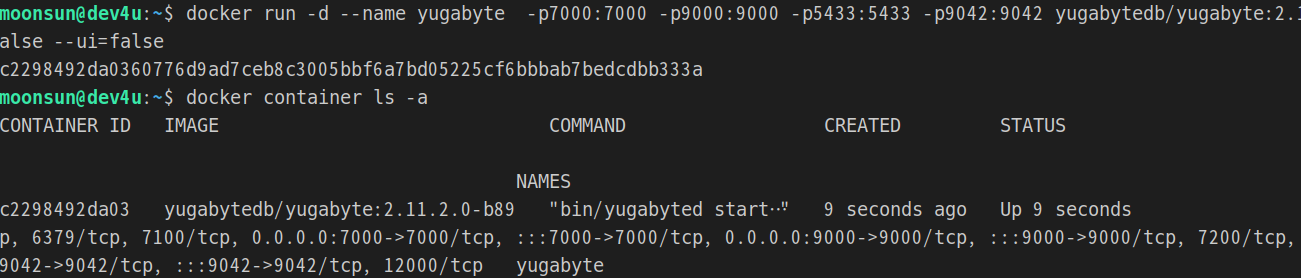 $ docker run -d --name yugabyte -p7000:7000 -p9000:9000 -p5433:5433 -p9042:9042 yugabytedb/yugabyte:2.11.2.0-b89 bin/yugabyted start --daemon=false --ui=false
