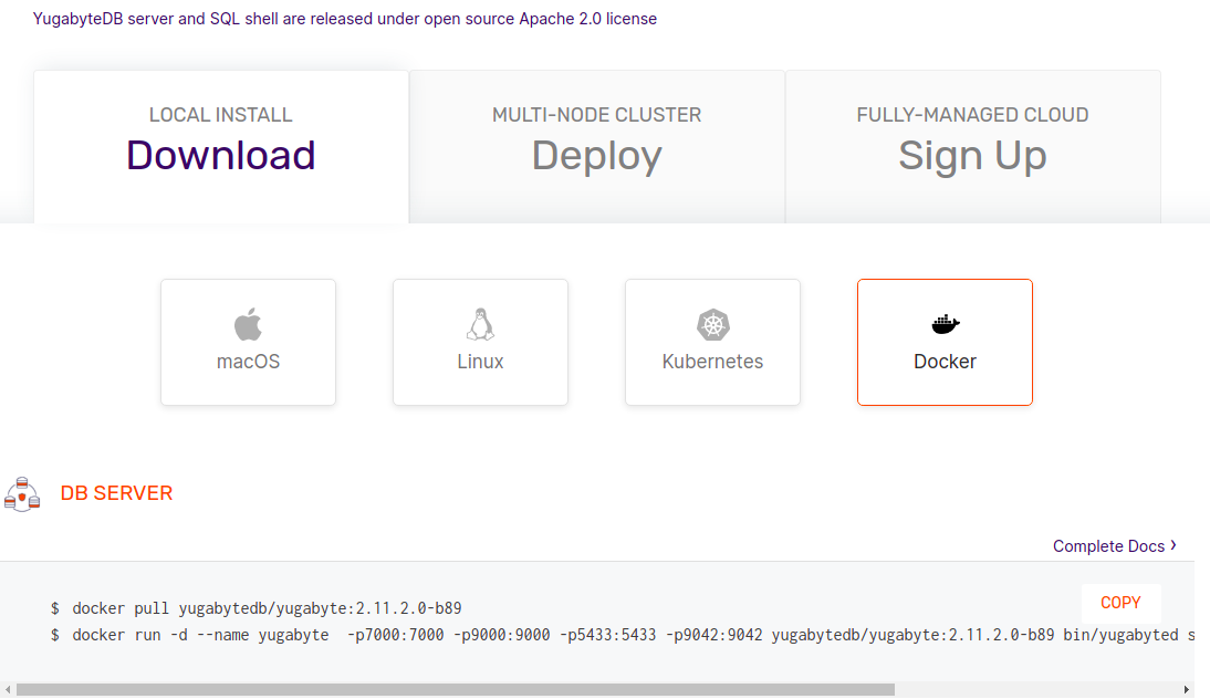 # LOCAL INSTALL 탭에서 Docker를 선택하면 도커 이미지를 다운로드 받고, 실행해 볼 수 있는 스크립트가