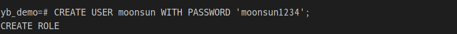 yb_demo=# CREATE USER moonsun WITH PASSWORD 'moonsun1234';