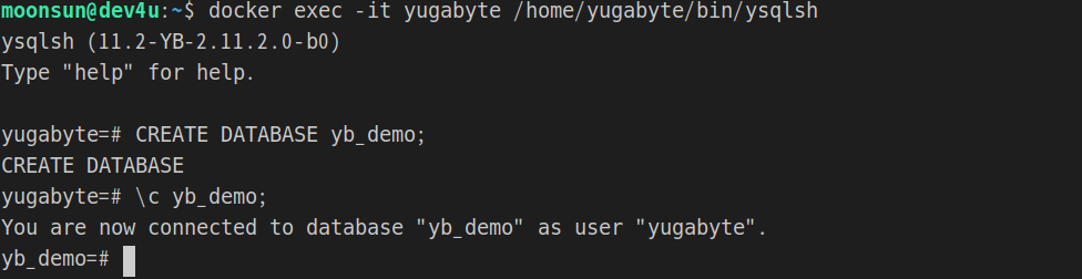 moonsun@dev4u:~$ docker exec -it yugabyte /home/yugabyte/bin/ysqlsh yb_demo