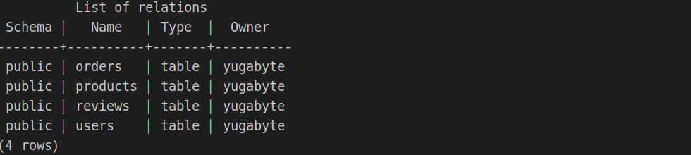 yb_demo=# \i share/schema.sql