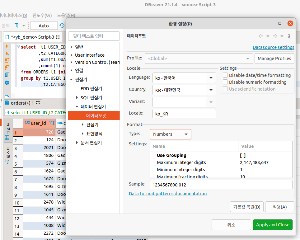 * 데이터 출력창에서 숫자 타입의 컬럼에 콤마(,)가 안보이게 하려면, 그림과 같이 환결설정에서 Use Group 항목의 체크를