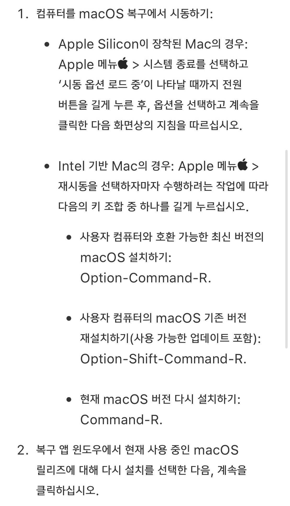 오랜만에 클린 설치를 하는 거라서 초반에 좀 실수를 했습니다. "Command + R"로 해서 계속 현재 버전으로