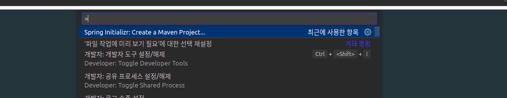 2개의 Extention를 설치한 후에 vscode에서 "Ctrl + Shift + P"를 눌러서 "명령 팔레트" 열고 "Spring Initializr: Create ~~"