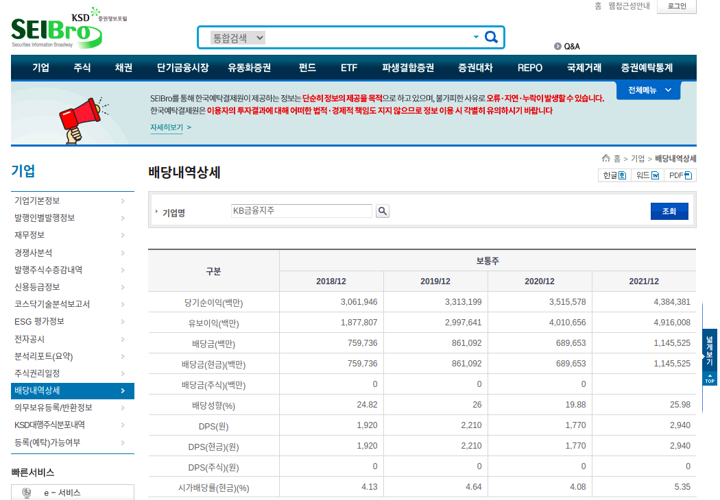 경로) 증권정보포털 -> 기업 (탑메뉴) -> 배당내역상세 (좌측메뉴)