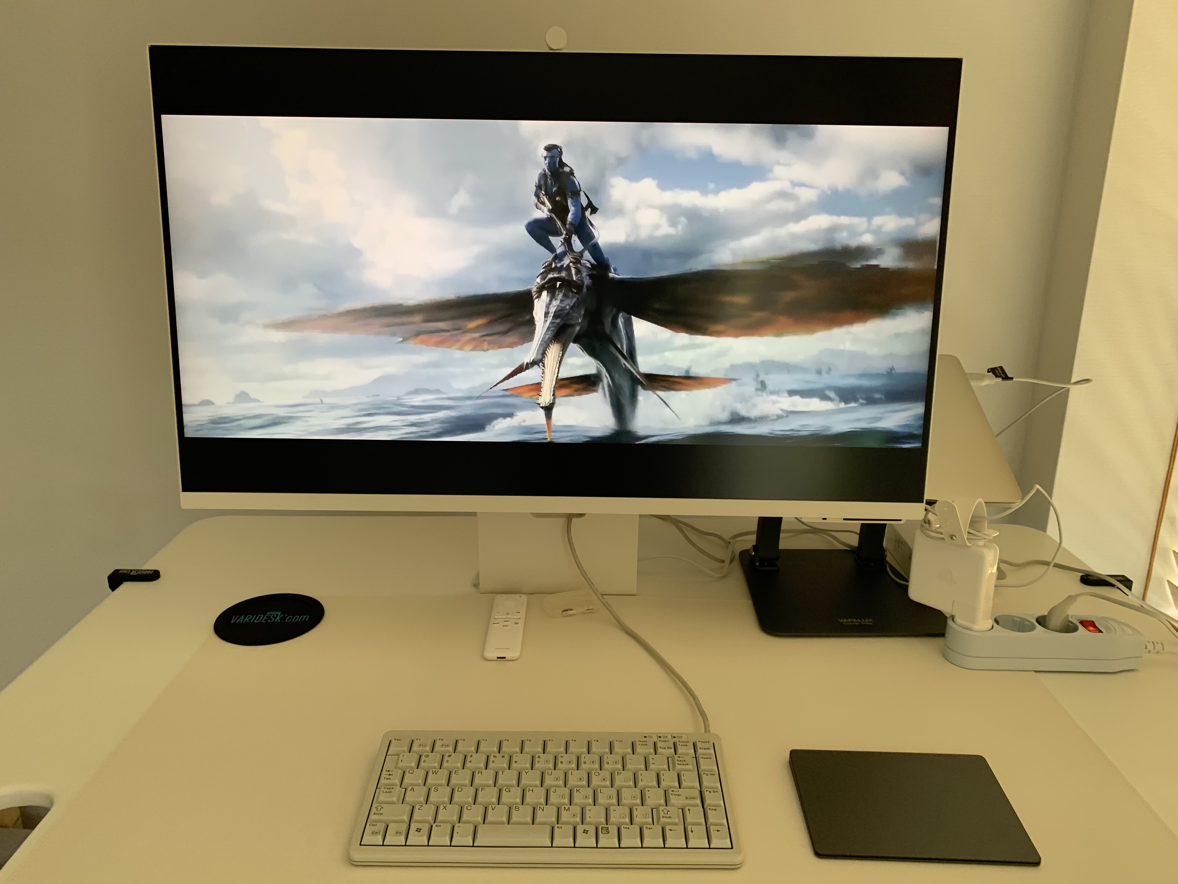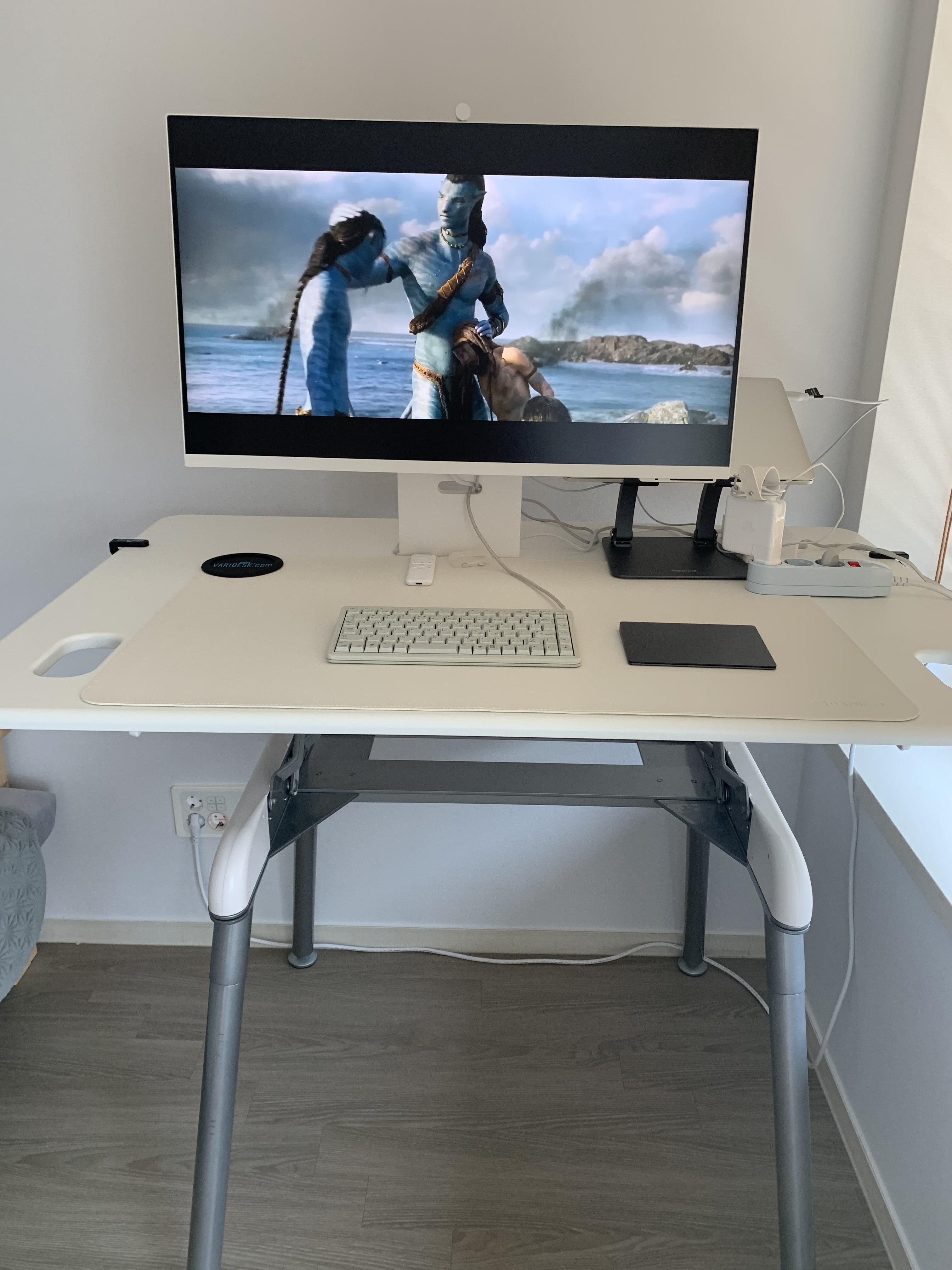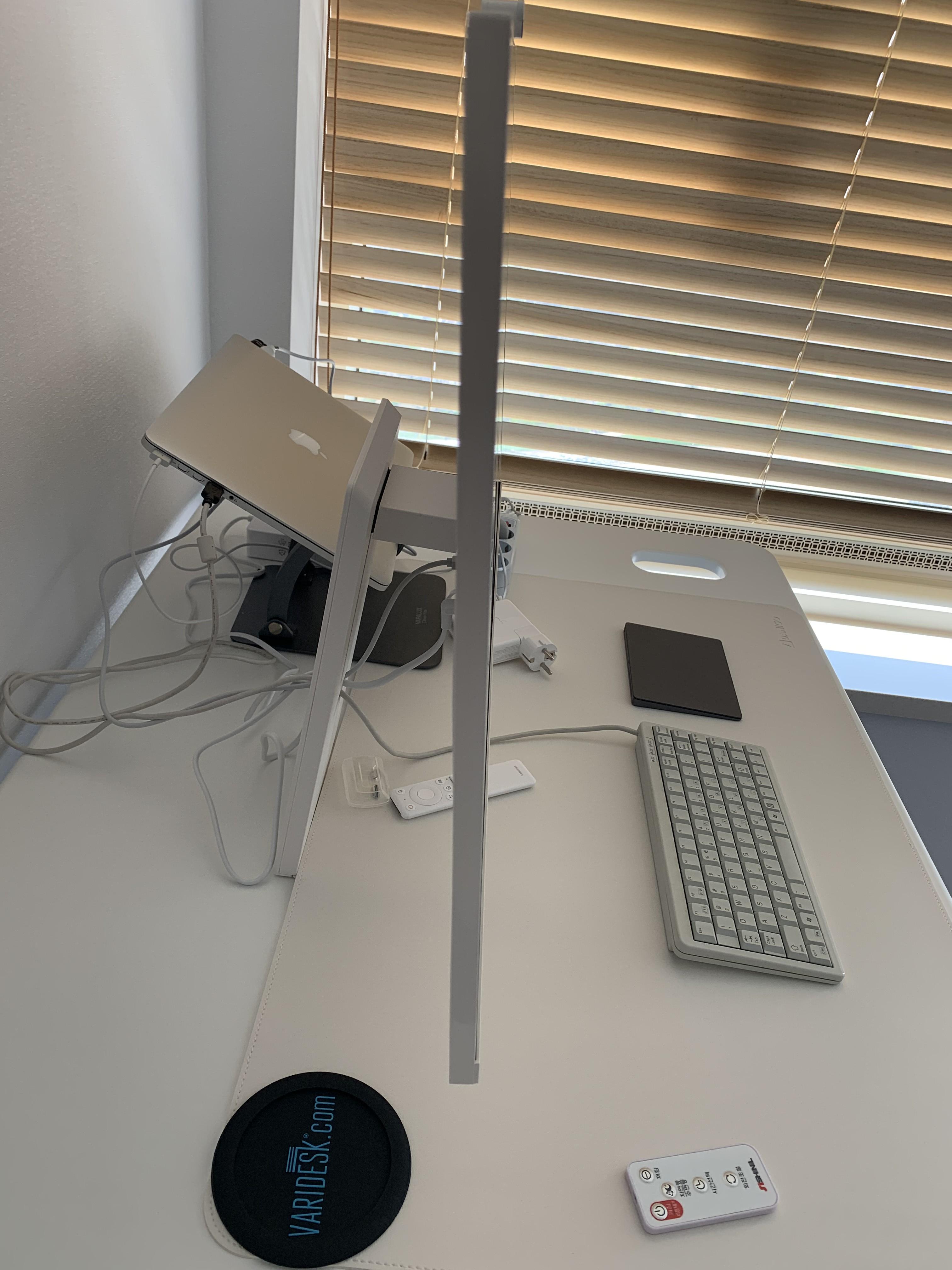 "스탠딩 데스크 / 맥북 프로 / 매직 트랙패드 / 체리 미니키보드 / 스마트 모니터 " 조합으로 완벽한 홈 오피스가 완성 되었습니다.