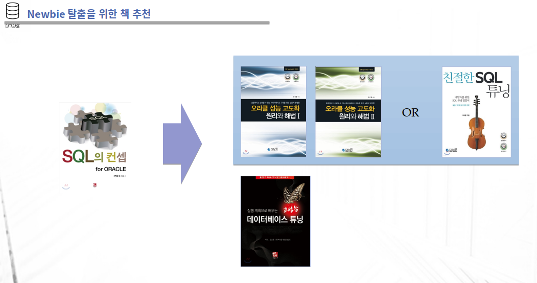 그리고 제가 제일 좋아하는 책인 "오라클 성능 고도화 1,2" 또는 "친절한 SQL 튜닝" 책을 통해서 중.고급 개념을