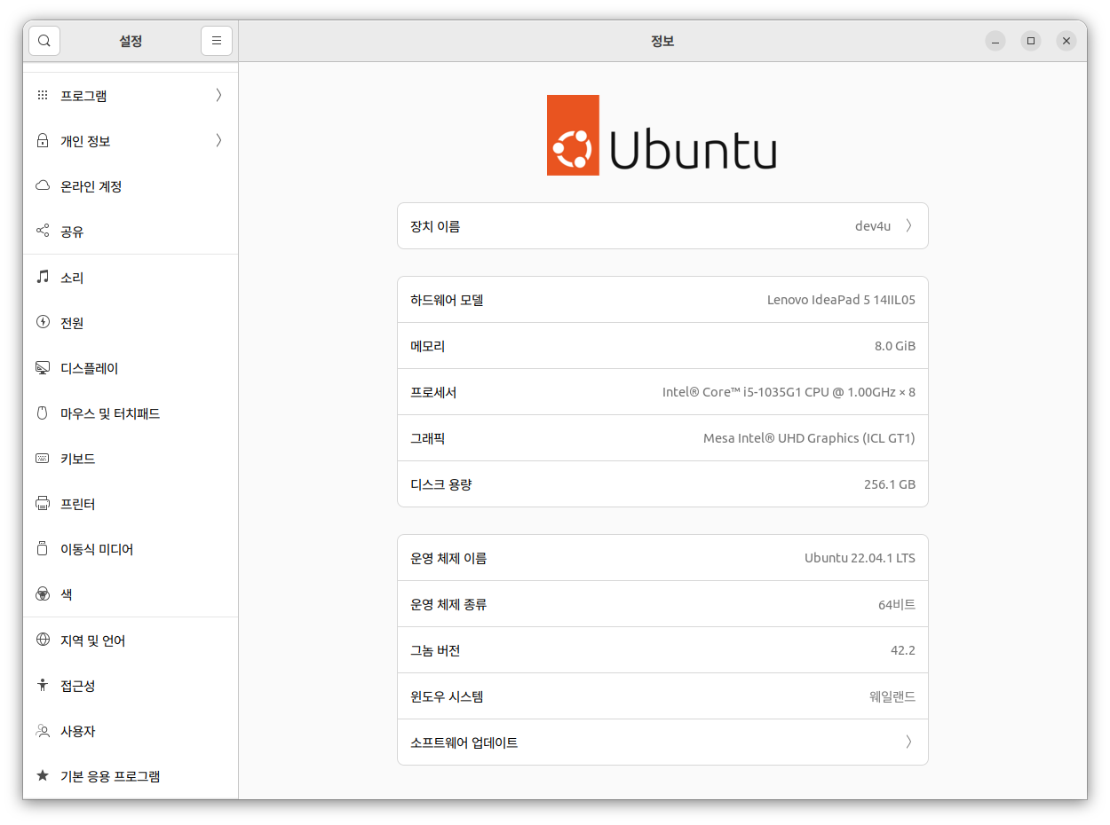 며칠 전에 "Ubuntu 22.04.1 LTS"로 업그레이드가 가능하다는 알림이 왔습니다. 그때는 시간이 없어서 미루어 두다가 오늘