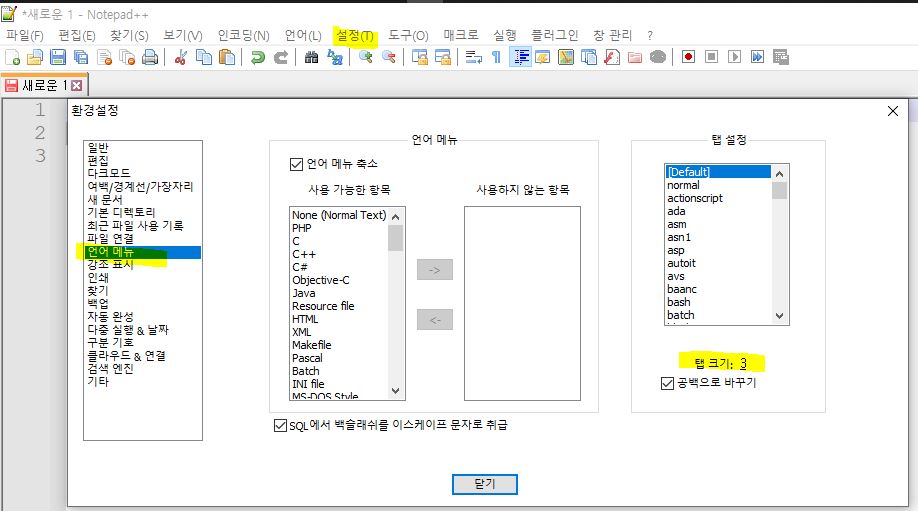 울트라 에디트는 메뉴에 "탭을 공백으로" 변경하는 게 있는데 Notepad++에서는 없었습니다.