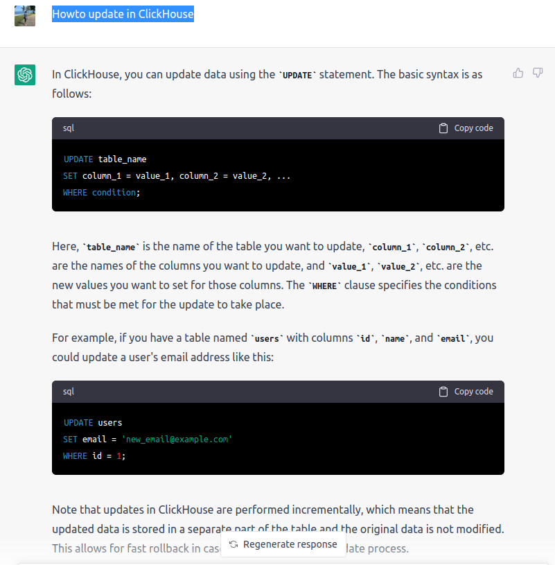 그런데, ChatGPT에서 ClickHouse에서 "Howto update in ClickHouse" 검색을 해보니 아래와 같이 답변을 주네요.