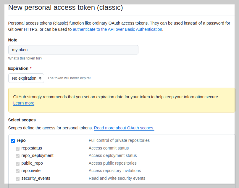 프로필 -> Settings -> Developer Settings -> Personal access tokens (classic) 에서 새로운 토큰 생성후에 토큰 문자열 복사