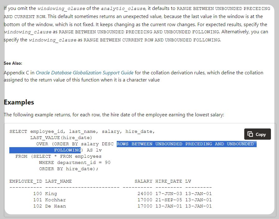 따라서, LAST_VALUE() 사용시에는 위의 예시와 같이 windowing 절을 추가해 줘야 원하는 값을 얻을 수 있습니다.