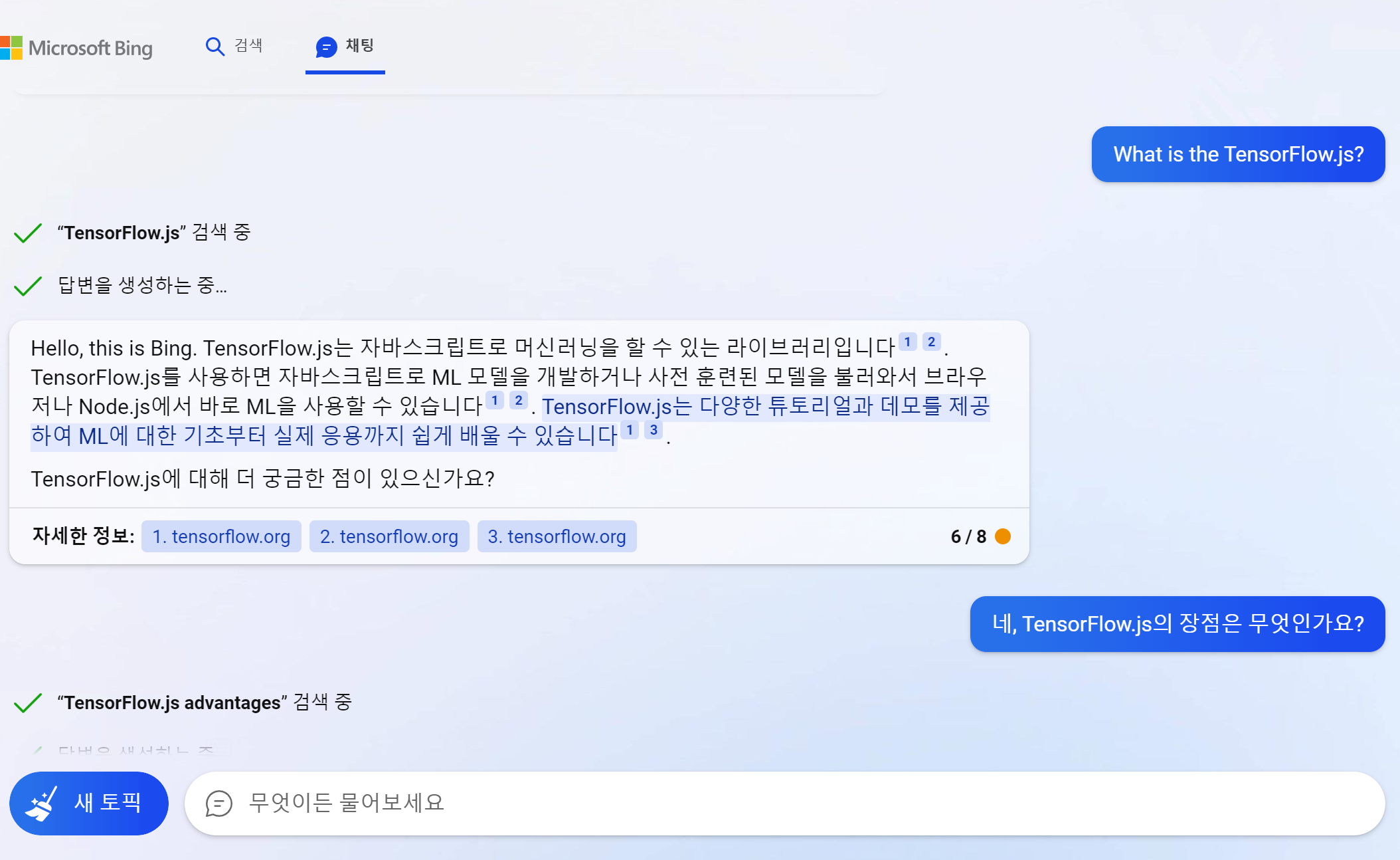 TensorFlow.js에 대해서 물어본 내용